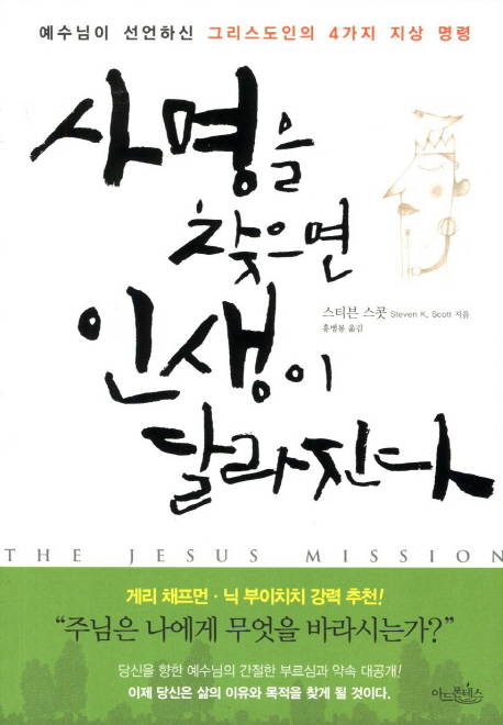 소개: 그리스도의 발걸음을 인도하며 그의 사랑 안에 거하는 삶! 『사명을 찾으면 인생이 달라진다』는 하나님이 우리의 삶에서 기대하는 바를 일깨우는 책이다. 미국의 기업가 스티븐 스콧은 이 책에서 그리스도께서 우리에게 주신 네 가지 사명에 눈뜨도록 유도하며, 예수님이 그 자신과 이 땅에서 행하신 일을 드러내는 방식을 소개하고 있다. 실직과 해고를 거듭하였지만 잠언과 솔로몬을 연구하여 세계적인 마케팅 그룹 아메리칸 텔레캐스트의 공동 설립자가 되었던 저자의 영적 깊이를 고스란히 느낄 수 있다. 기독교인들이 궁금해 하는 그들의 사명으로 하나님과 더욱 친밀해지기, 영적 성장에 힘쓰기, 다른 그리스도인들을 돕기, 다른 이의 삶에 영향을 미치기 등으로 꼽으며, 실행을 촉구한다. 하나님이 우리에게 원하는 삶이 분명히 존재한다는 믿음을 바탕으로 하여 약속과 명령을 완수하도록 이끌어준다.