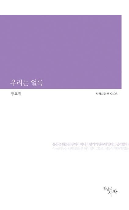 소개: 장요원 시인의 첫 시집『우리는 얼룩』. 장요원 시인의 시 세계에는 시적 자아의 미적 주관성이나 의지가 거의 드러나지 않는다. 그의 시 세계는 정서적 울림보다는 가치중립적인 사물성에 가깝다. 이 점은 그의 시 세계에서 시적 대상의 “본색”(「본색」)을 직시하는 풍경의 현상학에 충실하도록 한다. ‘무엇인가를 위한 의식’에 편향되지 않는다. 다만, 물자체의 본질과 존재성을 지향한다.