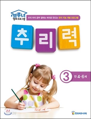 소개: [브루너 영재 프로그램 시리즈]는 지능 발달이 폭발적으로 이루어지는 만 2~6세 유아를 대상으로 유아의 발달 수준에 맞게 영역별, 단계별로 시리즈를 구성해 잠재된 영재성을 발현시킬 수 있게 교육 설계된 유아 인지지능 개발 프로그램입니다. 엄마가 옆에서 읽어 주고 이끌어 주며 활동에 함께 참여하던 기존의 아이들 책과 달리 아이들이 주도적으로 IQ 테스트 문제 형식으로 구성된 그림을 보면서 직관적인 통찰력으로 답을 찾아보며 활동하는 새로운 형식의 유아 워크북 시리즈입니다. 관찰, 추리, 기억, 분류, 유추 등 지능 영역별로 나누어 내용이 구성되어 있어 아이들은 지적 호기심과 흥미를 유발 할 수 있는 다양한 지능 영역의 문제들을 통해 고급 사고 기능을 발달 시킬 수 있습니다.