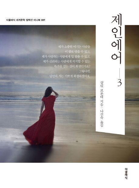 소개: 19세기의 가부장적인 요소를 타파하고 여성들에게 부여된 잘못된 삶을 날카롭게 비판하는 올곧고 당당한 소녀의 성장과 사랑『제인 에어』제3권. 이 작품의 배경인 빅토리아조의 19세기 영국 사회 여성들은 남성에 비해 사회 진출이 매우 제한적이었다. 결혼, 출산, 육아, 살림 등을 충실히 해내야만 ‘바른 여성’의 삶을 산다고 평가받을 수 있었다. 때문에 샬럿 브론테 역시 자신의 본명이 아닌 커러 벨이라는 남성의 이름으로 《제인 에어》를 발표했다. 물론 주인공 제인이 추구한 가치도 바른 여성의 삶이었다. 다만 그녀는 자신의 삶을 주체적으로 선택하고, 매 순간 당당하게 인생을 개척해 나가는 현대 여성의 모습을 보여 주었다. 여성이 열정과 삶의 주체가 되었다는 점과 여성에 대한 보수적인 관념을 타파했다는 사실만으로도 이 작품은 문학사에 길이 남을 놀라운 성취를 이뤘다.