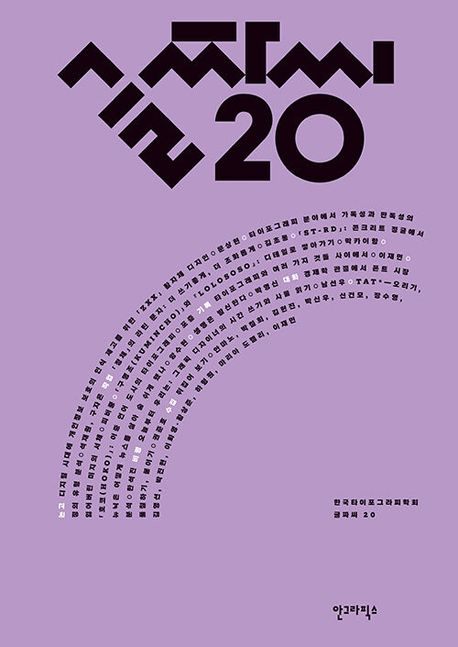 소개: 한국타이포그라피학회는 글자와 타이포그래피를 연구하기 위해 2008년 창립됐다. 한국타이포그라피학회의 학회지인 『글짜씨』는 2009년 12월부터 발간한 국제 타이포그래피 저널이다. 2021년 8월 20번째 학회지인 『글짜씨 20』에는 20주년을 기념해 제작한 특별 한정 책갈피를 동봉했다.『글짜씨 20』는 개인정보 보호를 위해 상징적인 활자체 디자인을 고민하는 디자이너부터, 시간과 질감을 넘어서 더 큰 내러티브를 찾는 디자이너, 경제학의 관점에서 폰트 시장을 분석하는 등 다양한 각도로 새로운 시대의 디자인을 짚어낸다. 타이포그래피에 대한 솔직한 기록과 대화는 디자이너의 시각과 삶 그리고 새로운 글자들을 만들 수 있으리라 기대되는 부분이다.더 쓰기 좋게, 더 조화롭게디지털 시대 글자를 모색하다『글짜씨 20』 논고에서는 디지털 시대 개인정보 보호 인식을 제고하기 위해 새로운 활자체 「ZXX」를 디자인한 문상현 디자이너의 작업과 디지털 감시 사회에 대한 비판을 읽을 수 있다. 타이포그래피 분야에서 가독성과 판독성의 정의 유형을 분석한 석재원, 구자은의 글은 가독성과 판독성, legibility와 readability의 혼란을 막기 위해 국내외 타이포그래피 서적을 통해 각각 그 정의를 수집하고 분석해 유형화하는 작업을 진행했다.작업 부분에서는 재해석된 글자들이라는 주제로 서울과 홍콩의 디자이너 네 명의 작업을 소개한다. 이들은 자신의 모국자에 다른 지역의 문자를 디자인 작업에서 중요한 매개체로 삼고 있다. 디자이너의 고유한 생각과 원칙으로 타이포그래피적 질서를 세우며 문자를 만드는 과정은 문자의 국제성을 재해석하는 과정을 살펴볼 수 있다.기록에서는 「타이포잔치 사이사이 2020-2021: 국제 타이포그래피 비엔날레」의 디자인·생명·환경·문자에 관해 연구한 국내외 여섯 명의 디자이너와 활동가를 초대해 케이스 스터디와 통찰을 공유했다. 대화에서는 2021년 2월 한석진이 티스쿨(T/SCHOOL)에서 한 「경제학적 관점에서 폰트 시장 분석」 강연을 글짜씨 독자를 위해 더 쉽게 풀어서 제시한 글이다. 마지막 수집 뒤집어보기에서는 시선의 변화를 통해 형태의 가능성을 실험해 위아래로 뒤집었을 때 같은 또 다른 뜻으로 읽히는 글자, 한글과 라틴 문자의 획을 유기적으로 결합한 글자 등을 포함해 열두 개의 글자 실험을 제시했다. 그림 같은 글자를 뒤집어 보고 사유하는 시간을 통해 시각적 쾌감을 느낄 수 있을 것이다.