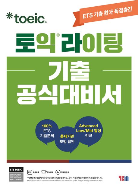 소개: YBM, TOEIC Writing 토익라이팅 기출문제 한국 독점출간!토익라이팅 Advanced Low/Mid 달성의 삼. 박. 자.공부하세요, 1 실제 시험에 출제된 문제들만! 2 출제기관이 만든 모범 답안과 함께! 3 출제기관이 제시하는 분석과 전략으로!이 책은 TOEIC® Writing(토익라이팅) 출제기관인 ETS에서 독점으로 제공하는 공식수험서입니다. 이 책에 수록된 모든 토익라이팅 문제는 한국에서 실제로 시행된 기출문제들이며, ETS에서 직접 만든 모범 답안들이 제공됩니다. 또한 Advanced Low/Mid 이상을 목표로 시험을 준비하는 수험자들을 위해 오랜 시험 분석과 연구를 통해 체계적으로 정리한 시험 전략을 전격 수록하였습니다.