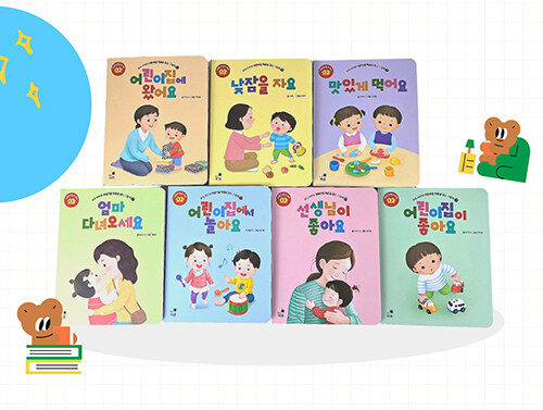 소개: 어린이집은 어떤 곳일까? 누가 있을까? 불안한 마음과 함께 호기심 가득한 우리 아이의 어린이집 적응을 돕는 그림책 시리즈로 실제 어린이집 환경과 놀잇감, 하루 일과 모습을 있는 그대로 소개하고 있다. 영유아교육 전문 연구기관에서 아이의 어린이집 적응을 위해 꼭 필요한 내용을 선정하여 전 7권에 담았다.낯선 환경에 적응하기, 부모와 분리하기, 선생님과 애착 형성하기, 낮잠자기, 식사하기, 즐겁게 놀이하기, 편안하게 하루일과 보내기를 주제로 어린이집의 일상을 편안하고 재미있게 소개하고 있어 아이가 안정적으로 어린이집에 적응할 수 있도록 돕는다.